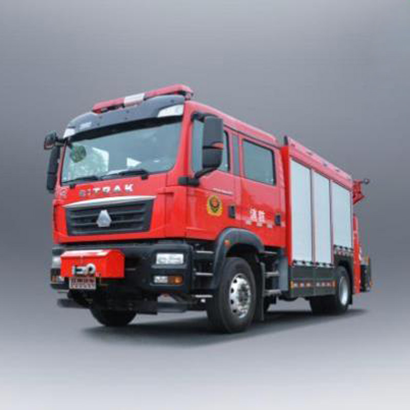 抢险救援消防车整车主要由机动性能较高的特种作业车底盘、铝合金上装厢体、电源保障系统、随车起重折臂吊机、高杆照明系统、车载电台、器材舱、平式/立式拓展板机构、卷帘门、梯台及护栏、警灯警号、随车器材等组成。