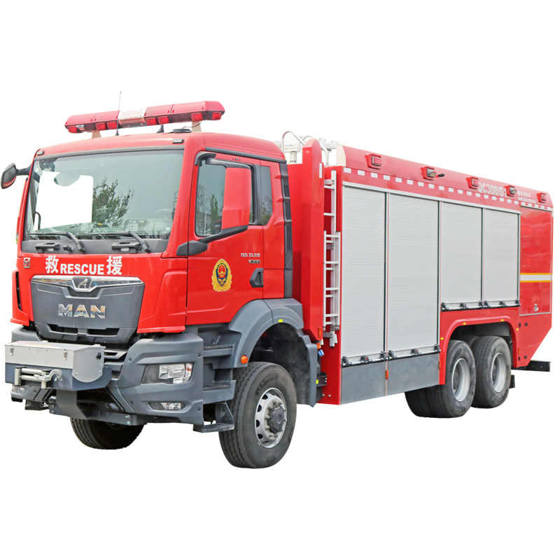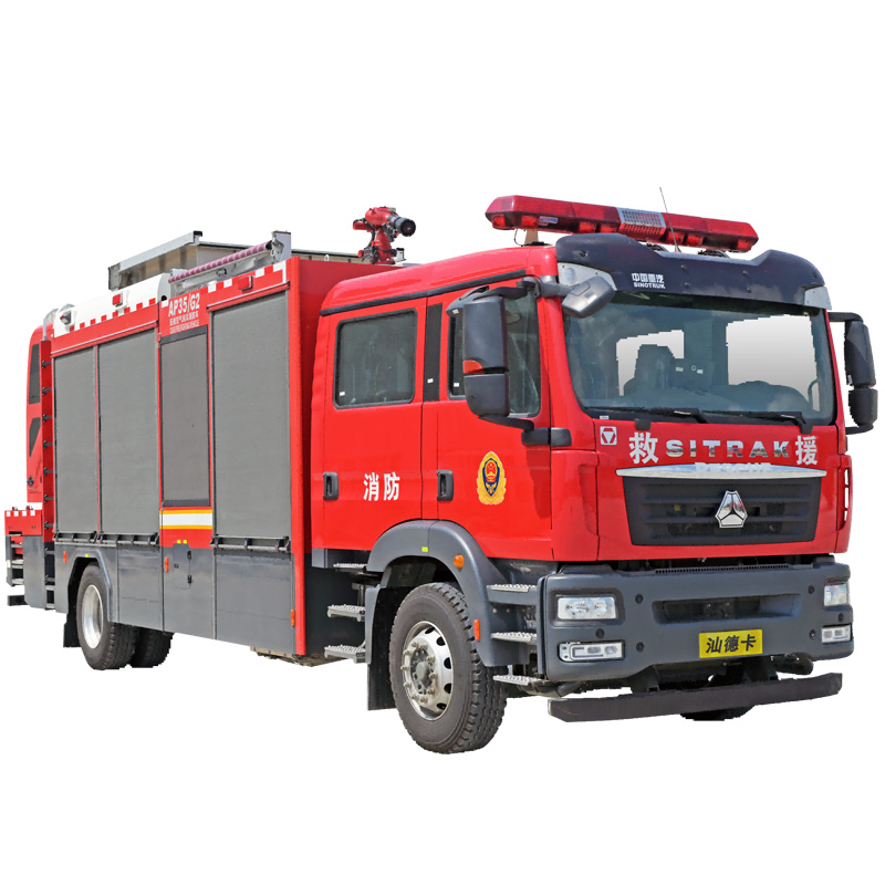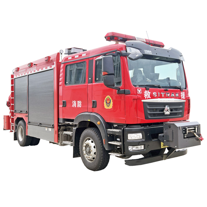 抢险救援消防车配备发电照明系统、牵引绞盘系统、随车起重机系统,上装采用铝型材箱体框架并配备了各种抢险救援器材,该车主要适用于高速公路事故、城市突发公共安全事故以及各种化工场所突发事故的救援。