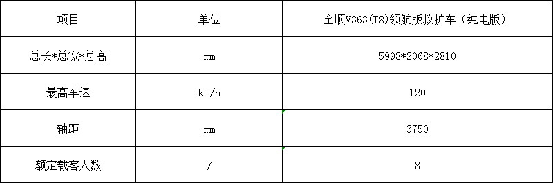 全顺V363(T8)领航版救护车(纯电版)医疗舱布局包含:中门后单人椅+朝前折叠旋转椅+两人长排椅、担架、透明吊柜+医疗操作台、中门座椅+扶手、隔断后滑移座椅+医疗设备存放柜、语音、触屏、按键集成控制